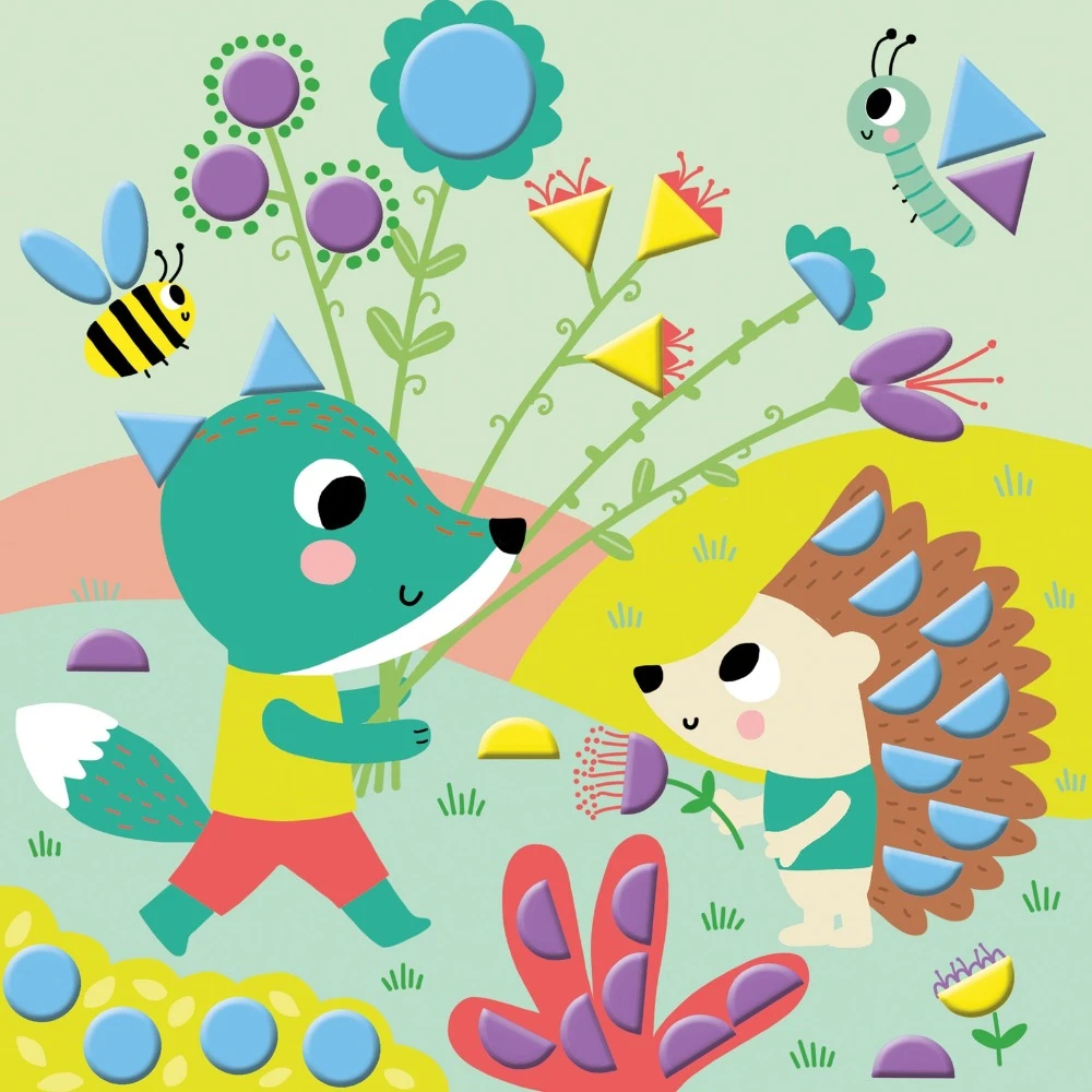 JANOD atelier knutselset met geometrische stickers, een creatieve set voor kinderen vanaf 3 jaar. Kies 1 van de 4 afbeeldingen en plak de stickers op de juiste plek. Tadaa! Jouw kunstwerk is klaar!