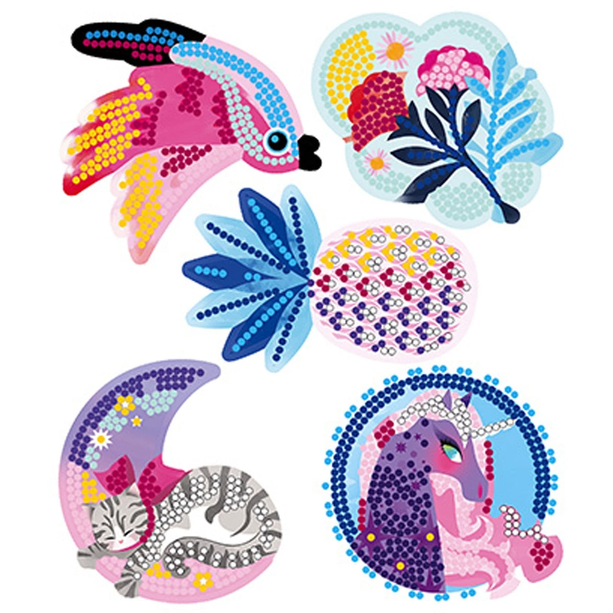 Deze knutselset kristallen pixels van JANOD atelier is een mooi cadeau voor creatieve kinderen. De set bestaat uit 5 verschillende kartonnen decoraties. Deze zelfklevende kaarten versier je zelf met de 1500 stukjes mini strass, een erg precies knutsel werkje. Is je kunstwerk klaar? Dan hang je hem op aan 1 van de 5 lintjes.
