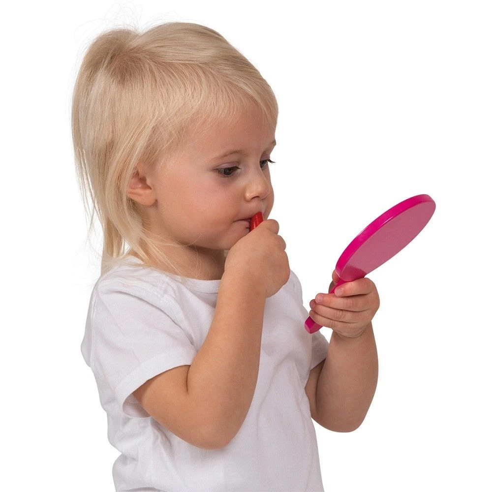 De set bestaat uit een roze toilettas met houten make up spulletjes; een make-updoosje met penseel en ingebouwde spiegel, twee lippenstiften, een oogpotlood, een grote spiegel, 2 flesjes nagellak, een parfumflesje en een kam.