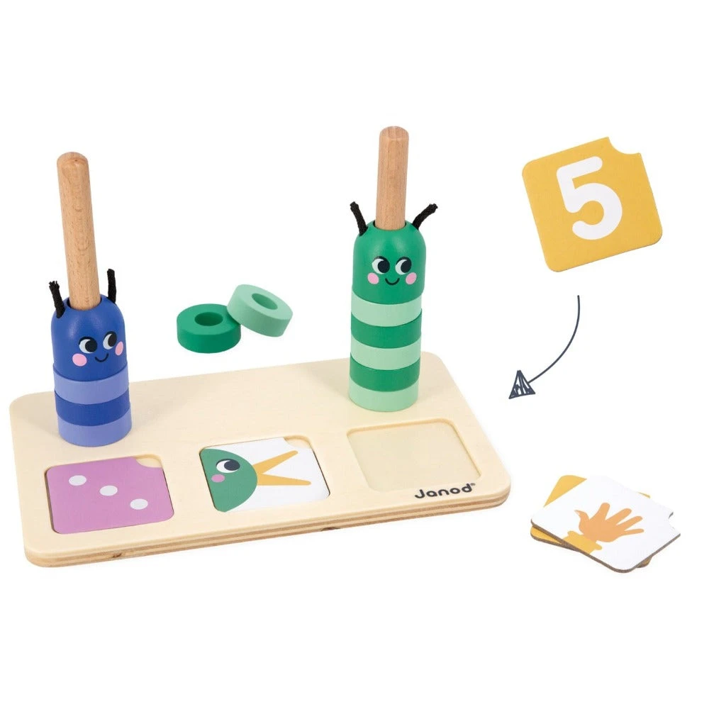 JANOD cijferspel uit de Pedagogie serie, een educatief spel voor peuters vanaf 3 jaar om te oegenen met tellen en rekenen. Vul de rups met het aantal kralen op het voorbeeld. Hoeveel kralen moeten erbij of eraf om op het volgende cijfer uit te komen?