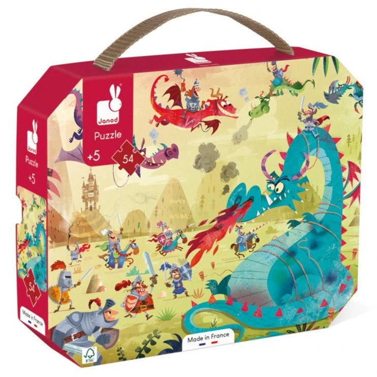 Een puzzel van JANOD met draken en ridders, een puzzel voor kinderen vanaf 5 jaar. De kinderpuzzel heeft 54 stukjes en zit verpakt in een puzzelkoffer.