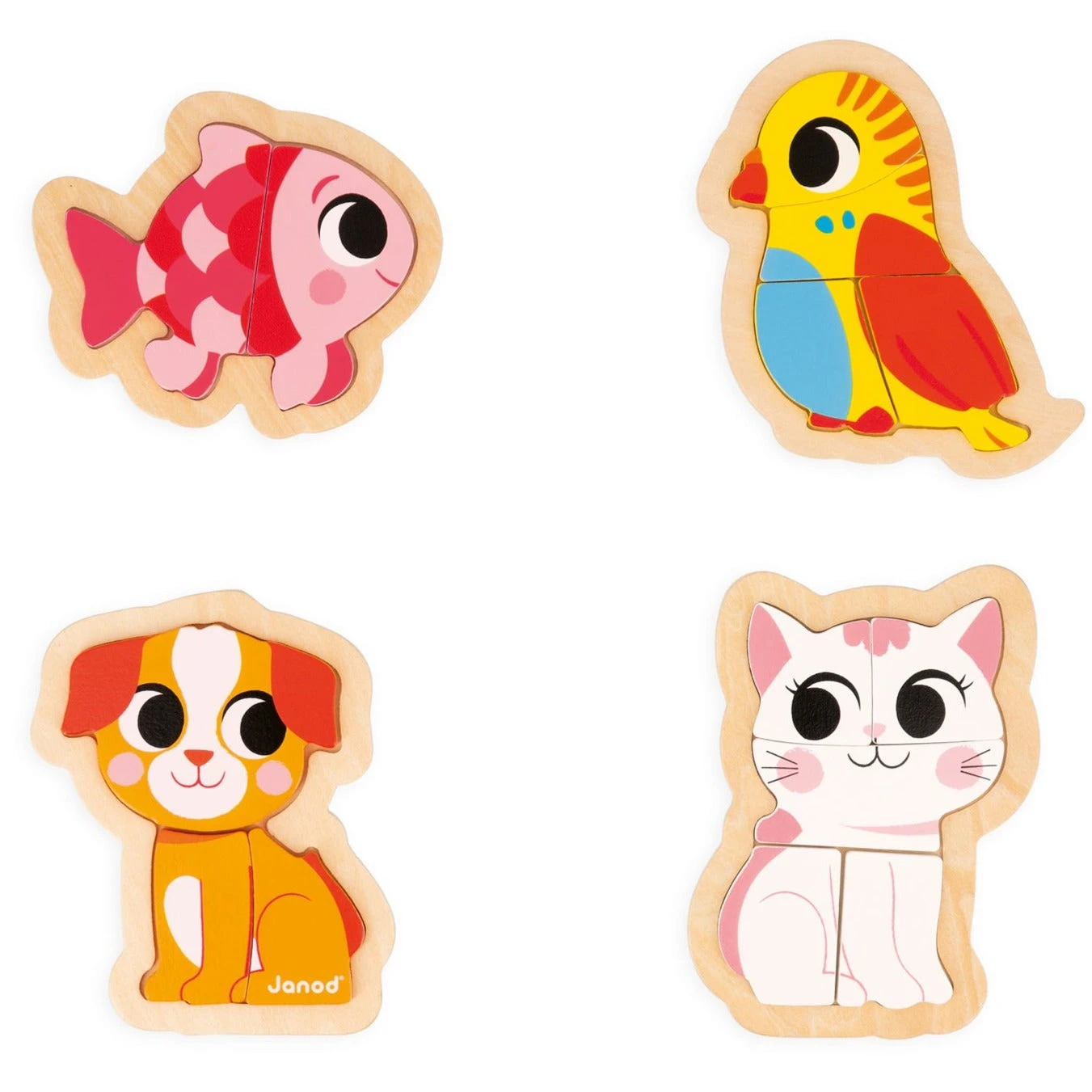 JANOD puzzels met 4 verschillende huisdieren met 2, 3, 4 en 5 houten puzzelstukken. De houten legpuzzels zijn geschikt voor kinderen vanaf 18 maanden.
