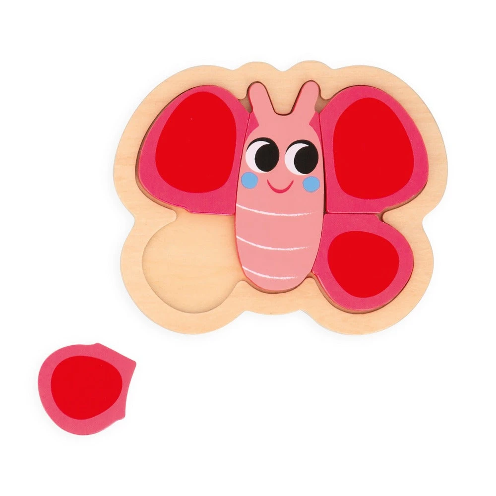 De houten puzzelstukken plaats je in het houten puzzelbord. De slak heeft 2 puzzelstukjes, de schildpad heeft 3 puzzelstukjes, Het konijn heeft 4 puzzelstukjes en de vlinder heeft 5 puzzelstukjes. Alle puzzels hebben een verschillend formaat, de schildpad is 11.8 x 17.5 cm.