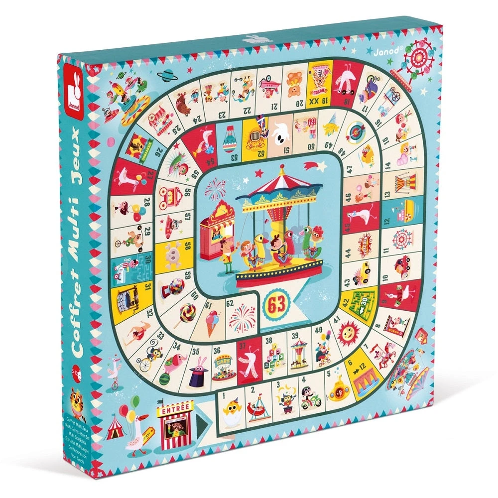 Niet 1 maar 50 spellen van JANOD met een kermisthema. De doos bevat 1 ganzenbord, 1 ludo, 1 damspel, 1 gele dwerg, 1 kwartetspel,1 spel met 54 kaarten, 5 dobbelstenen en een boekje met de 50-spelregels (LET OP, niet in het nederlands). De pionnen van het paardenspel, ganzenbord, damspel en de dobbelstenen zijn van massief hout.