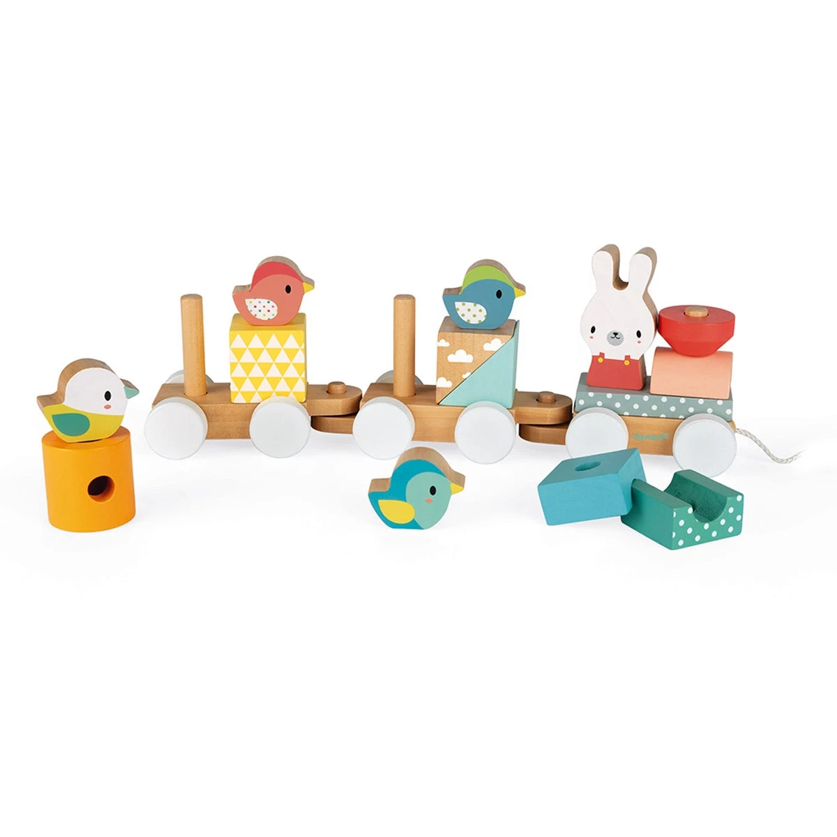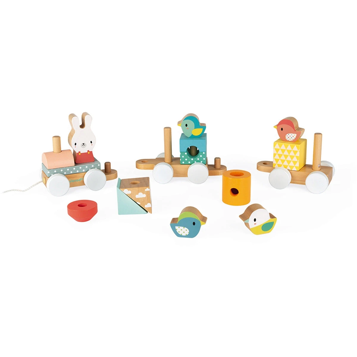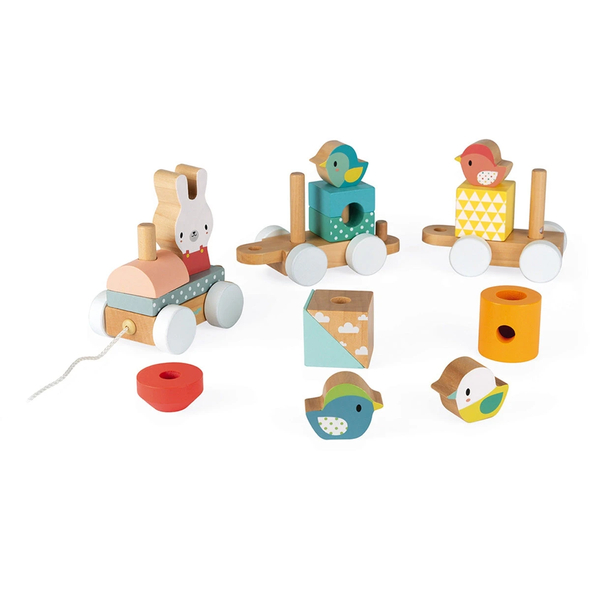 JANOD houten speelgoed trein uit de pure lijn. Een origineel kraamcadeau in zachte pastelkleuren. De houten trein heeft een locomotief en 2 wagonnetjes, elk gevuld met stapelblokken en dieren. Het konijn gaat vooop, gevolgd door 4 vogeltjes.